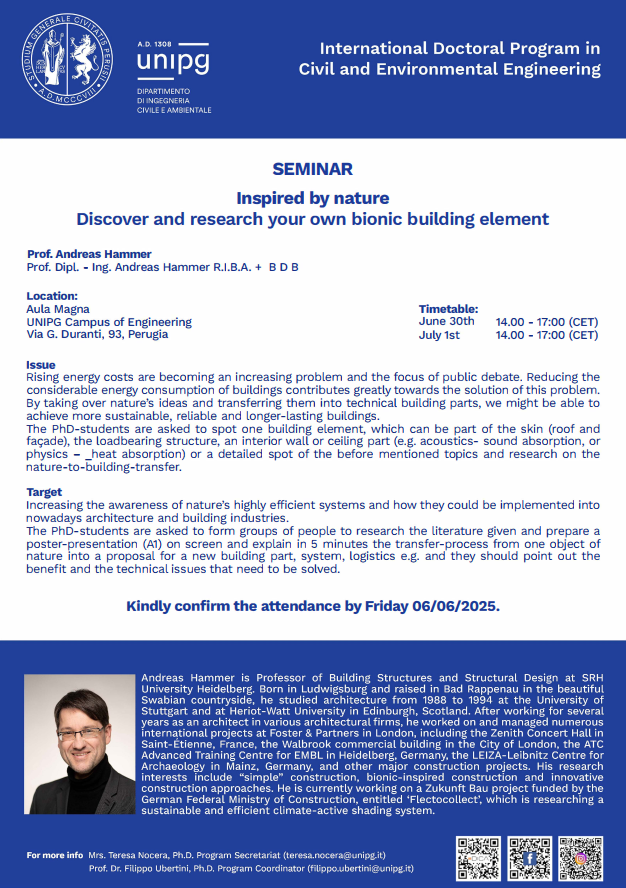 Il giorno 12/10/2023 alle ore 11:00 presso l’Aula Magna del Polo di Ingegneria dell’Università degli Studi di Perugia si terranno due prestigiosi seminari nell’ambito dell’International Doctoral Program in Civil and Environmental Engineering del DICA.