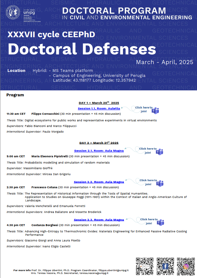 The Second “CEE_PhD Day” of the DICA International and Industrial Doctoral Program in “Civil and Environmental Engineering” will be held on October 28th from 9:30 am to 6:15 pm (CET) on Microsoft Teams Platform. During the day, the students of the XXXV and XXXVI Cycles will present their research activities carried out at UNIPG in collaboration with various international and industrial partners in front of the International Faculty Board. The program of the day with the titles of the speeches is available [here].
